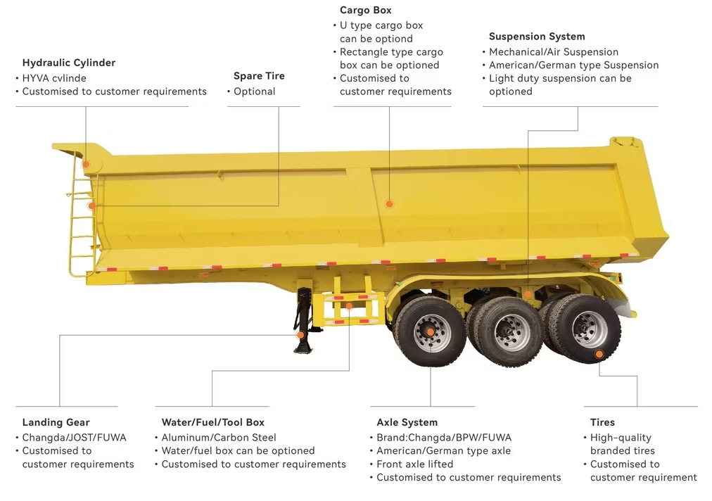 • Featuring a straightforward structure and highly interchangeable components, routine maintenance and part replacement for the tipper semi-trailer are exceptionally straightforward, thereby reducing long-term operational costs.