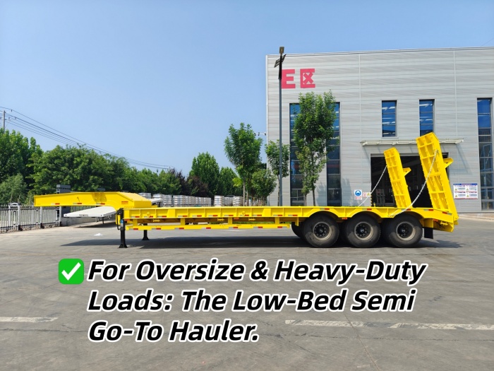 lowbed semi trailer The field of transporting large and heavy goods. suited for transporting large, heavy, and non-disassemblable cargo. Yes  Low centre of gravity design with a lower main platform surface. ✩✩✩✩✩